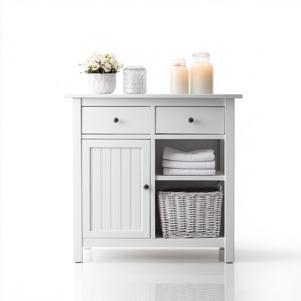 Il piano superiore offre una superficie stabile per l'appoggio di oggetti di uso quotidiano, mentre lo spazio interno consente di organizzare in modo ordinato gli accessori da bagno. Il design equilibrato favorisce una facile integrazione in diversi contesti abitativi.