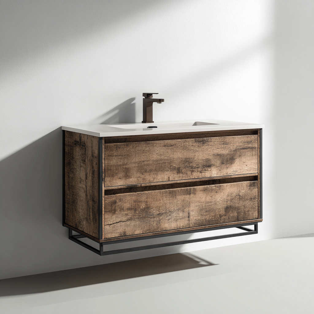 Il mobile è realizzato in MDF con finitura effetto legno marrone, abbinato a un lavabo superiore in ceramica bianca e a una struttura di supporto in metallo. Le superfici sono curate nei dettagli e pensate per garantire resistenza e durata nell'ambiente bagno.