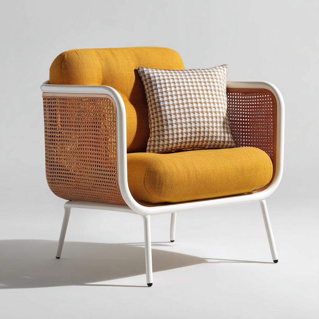 La struttura laterale è realizzata in rattan intrecciato con tonalità calde che valorizzano l'aspetto artigianale. Il telaio portante è in metallo con finitura bianca mentre la seduta è rivestita in tessuto giallo dall'aspetto materico e uniforme.
