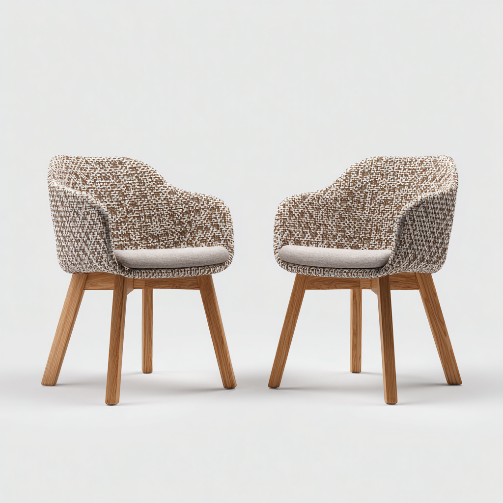 La seduta è realizzata in tessuto intrecciato nei toni marrone e bianco con una texture visivamente ricca. La struttura portante è in legno con finitura naturale che garantisce stabilità e valorizza l'aspetto complessivo del prodotto.