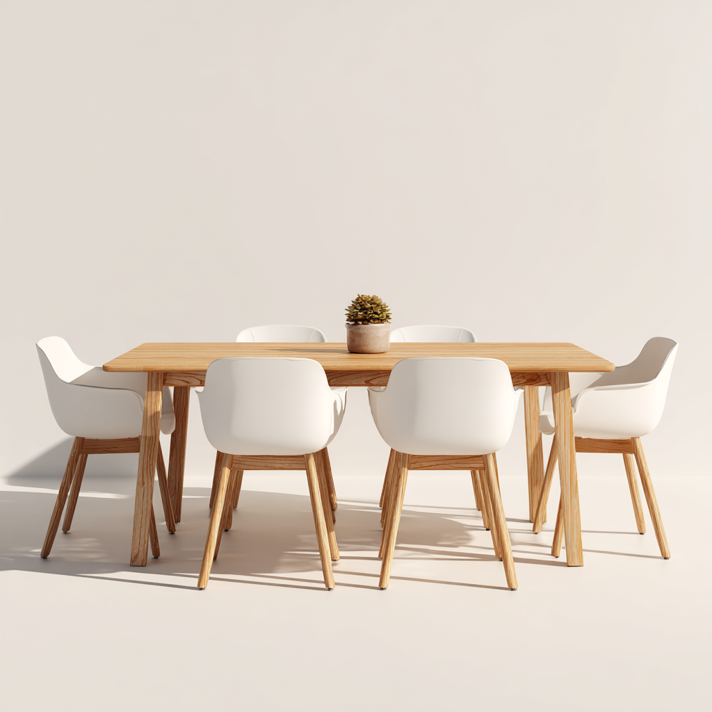 Il tavolo è realizzato in legno massello con finitura naturale che mette in risalto la struttura del materiale. Le sedie presentano gambe in legno massello abbinate a una seduta in plastica di colore bianco, creando un contrasto equilibrato e luminoso.