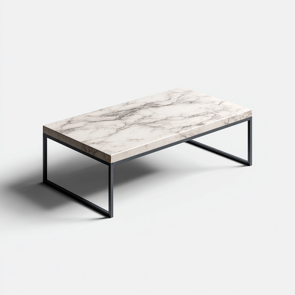 Il piano è realizzato in marmo di colore bianco con venature naturali e finitura uniforme. La struttura portante è in metallo di colore nero, progettata per garantire stabilità e solidità durante l'utilizzo.