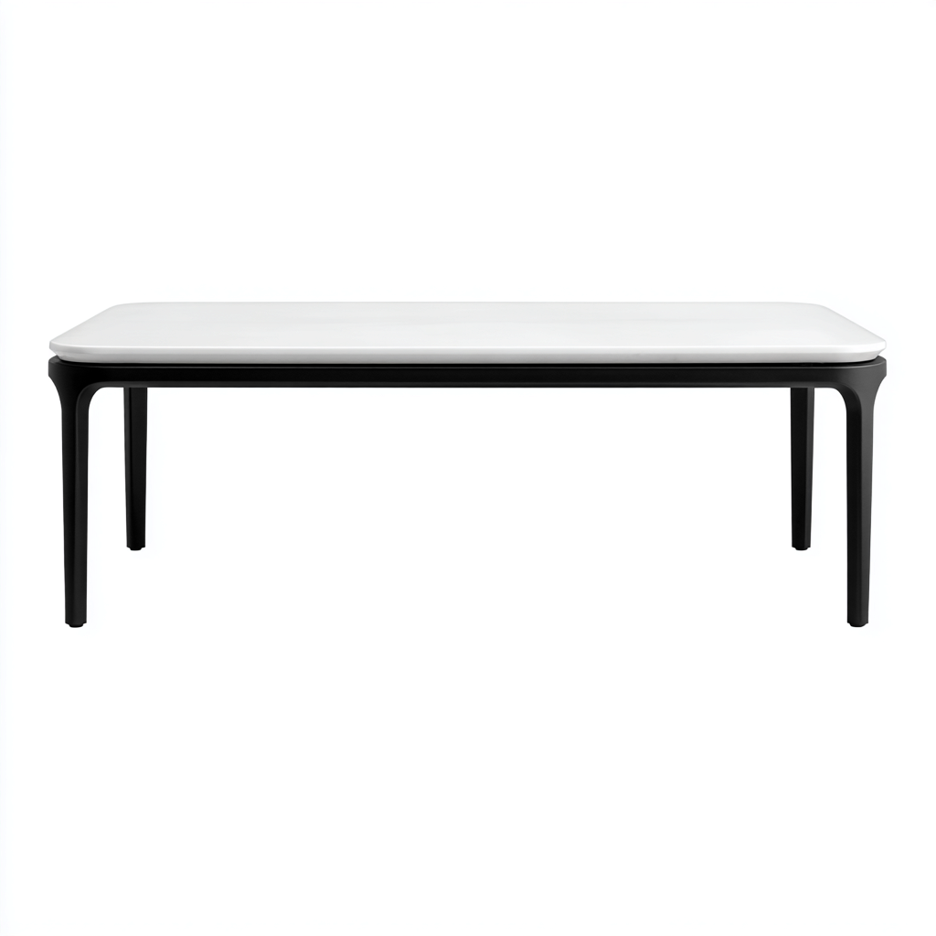 Il piano è realizzato in materiale composito di colore bianco con finitura uniforme e bordi arrotondati. La struttura portante è in metallo di colore nero, progettata per garantire stabilità e solidità durante l'utilizzo.